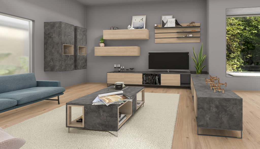Mebel V Gostinuyu Amarillo Mebel Dlya Gostinoj Iz Dsp Egger Korpus I Otkrytye Polki Cvet Seryj Kamen Fasady Kapskij Vyaz Belyj Pod Zakaz V Minske